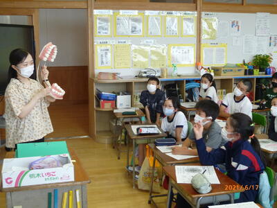 6年生では、養護教諭の齋藤先生から歯磨きの指導をしていただきました。(新型コロナ感染防止のために実技は実施しませんでした。)