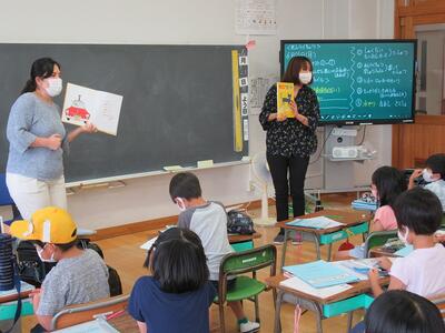 今日は2年1組で、ALTのマルセラ先生と図書室の伊藤先生による
