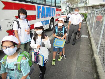 秋晴れの中、1年生から4年生が元気に遠足に出発しました。
