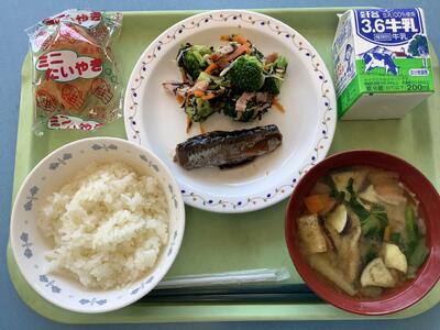 ごはん いわしの梅煮 ブロッコリーの和え物 味噌汁 ミニたいやき 牛乳