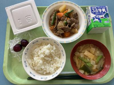 麦ごはん 納豆 牛肉の旨煮 味噌汁 ぶどう 牛乳