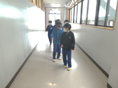 視覚障害について(講師:当事者の方 写真は視覚障害者の方の手引き体験)