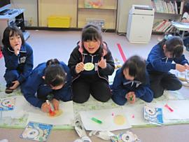水飴でおせんべいに絵を描いて食べるおやつの様子です。