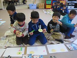 2月1日 「節分の日にどうして豆まきをするのか?」紙芝居で学んだあと、外に出て豆まきをしました。
