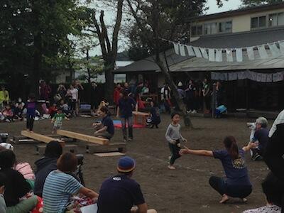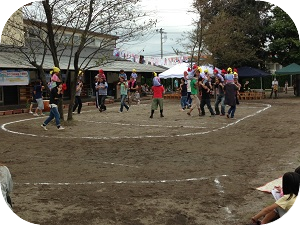 いも虫の動きから蝶に変身して軽やかに席に舞い戻る展開や、二人ずつ手をつないでスタートしてその後左右に一人ずつ散っていく展開。リズムの曲と基本の動きは深谷市のさくら保育園を起源とする定番化されたものですが、単にその動きをならべるのではなく、このようにより目覚ましく、そしてより合理的に展開するアイディアは、教科書に載っていたり誰かが教えてくれるものでは恐らくありません。保育者の発想のしなやかさに子どもたちが心地よく共鳴した結果です。また、途中、年長児との綱引き対決で登場する力持ち父さんのサプライズから小学生の出番までへとつながる「お楽しみ」アワーの心地よいおもしろさ。これらに、さらに誠実で協力的な全クラスの保護者さんがすべからく前向きに呼応することで、一つの作品のように織りなされる素晴らしい運動会。町でダントツ、ぴかイチ、子どもも大人も金メダルの運動会ではないでしょうか。(理事i)