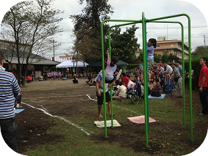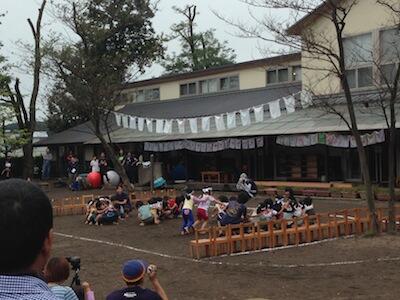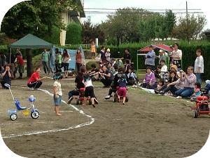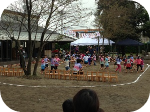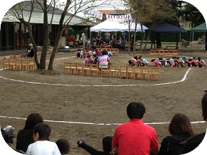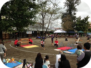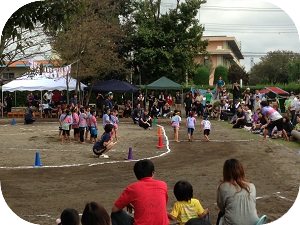各種目での、普段通りの子どもたちと保育者の、いきいき、のびのびした姿はもちろんすばらしいのですが・・・、各クラスの子どもたちの、自分の出番で席から出る、終わって戻る、他クラスを観る、そしてまた出る・・・のテンポの良さ。運動会への子どもたちの意欲と集中力、信頼する保育者たちと一体となった波長が見て取れ、会全体がみんなで一つのメドレーを奏でているかのようです。まさにスローガンが体現されることで見出される一体感です。
