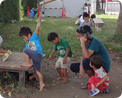 ゆいのわ保育園では、上記のような「子ども達をこんなふうに育てたい」と願う『子ども像』を描き、それらを念頭に保育を進めていきます。乳幼児期の生活を通し、自分を大切に思えること、つまり自己肯定感をしっかり太らせることは、自らの人生を自分らしく主体的に生きていくための土台となり、また他者の思いを尊重できる力につながっていきます。緑豊かな環境のなかで、仲間とともに全身を使って遊び、遊びの中で豊かな人間性や創造性を育み、さらに友達と意見を交わしながら自分の考えをまとめ上げていくことを大切にしていきます。