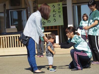 種目が終わって、押し花で作った「がんばったね」メダルをかけてもらいました。