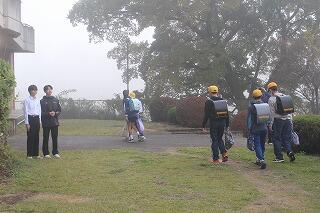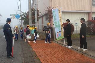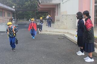 霧の濃い中、市貝中生徒と赤羽小児童が元気にあいさつを交わしていました。