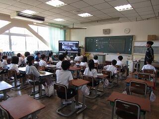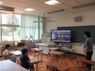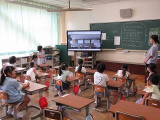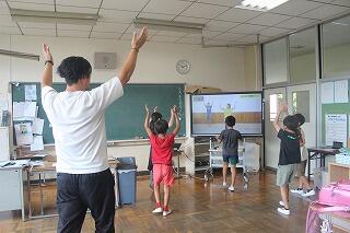 電子黒板に映し出された動画にあわせ、子どもたちは元気いっぱい