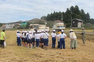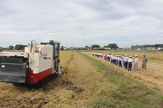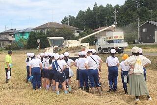 脱穀した米をコンバインからトラックに移す様子を見学したり、実際にコンバイン