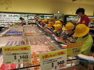 「かましんカルナ市貝店」へ社会科見学に行きました。品物を売るためにどんな工夫をしているか、お客さんをたくさん呼ぶためにどんなことをしているかなど売るための工夫をたくさん見付けてきました。お客さんやお店の方にインタビューをしたときは、最初は戸惑っていたものの、話をよく聞きながらメモをしていました。また、店長さんには、店内の説明を丁寧にしていただき、普段は入れないバックヤードも見させていただきました。見えなかったものが見えてきた社会科見学でした