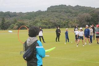 ディスクを使って、遠くに投げたり、ディスクを輪の中に通したり、ディスクを使って