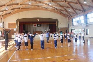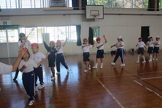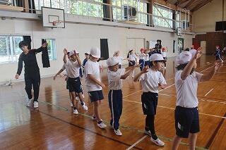 手と足の動かし方が難しい市貝音頭ですが、児童は講師の先生の説明や