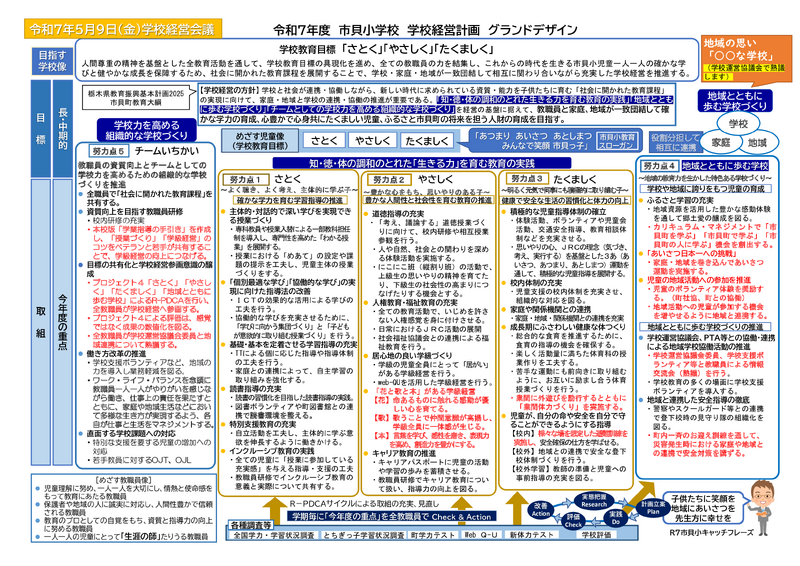 を経営の基盤に据えて、教職員と家庭、地域が一致団結して確かな学力の育成、心豊かで心身共にたくましい児童、ふるさと市貝町の将来を担う人財の育成を目指す。