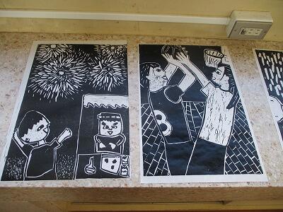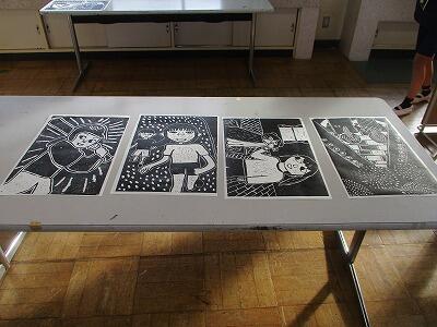 図工の「版で広がるわたしの思い」の学習で、木版画を製作しています。彫刻刀で掘る作業が終わり、印刷をしました。
