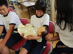 命の大切さ、命のつながりを理解することを目的として、助産師の先生をお呼びして「命の授業」が行われました。お母さんのお腹の中に初めて入ったときの胎児の大きさを知った子供達からは、「小さい~!」「かわいい~!」と言う声が上がりました。また、3,000gの赤ちゃんを抱っこする体験では、「思ったよりも重い!」「弟の小さい頃を思い出す!」と子供達からは笑顔がこぼれていました。また、助産師の先生の話の中であった、「みんなの命は45億分の1の確率で生まれてきた」「生きていれば100点満点」という言葉から、自分の命を大切に、そして周りの人の命も大切にしていきたいと感じていました。