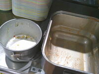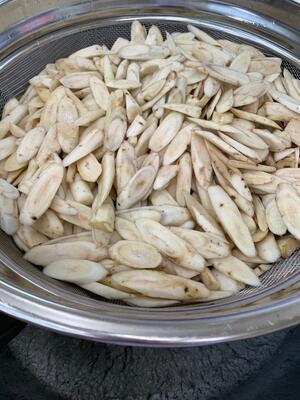 ・生のごぼうを斜め切りにして、あく抜きをします。すごい量なので、切るのもなかなか大変です