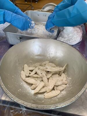 ・ごぼうと下味をつけた豚肉に片栗粉を付けて油で揚げます。