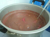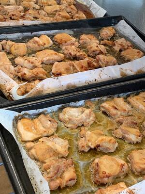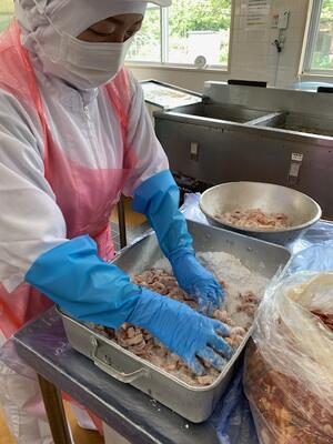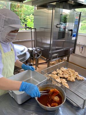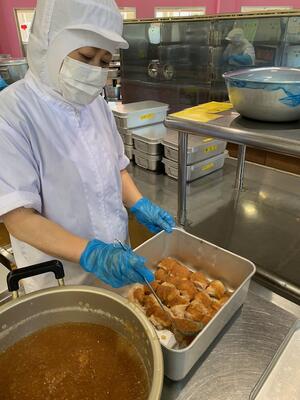 少し辛い味付けですが、子供たちに人気があります。朝から暑い日になりましたが、子供たちのために!!鶏肉ひとつひとつにタレをしっかりと付けて仕上げています。