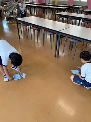 今日の給食はトースト。カリカリのパンを食べたということは、、、そうです!!床にパンくずがたくさん落ちます