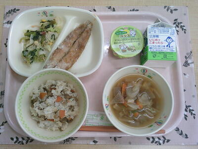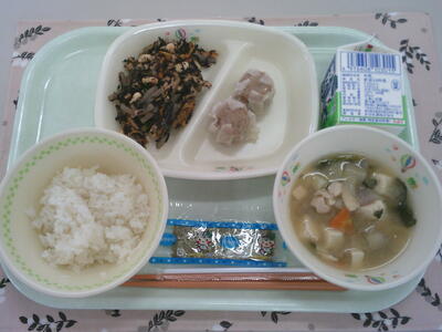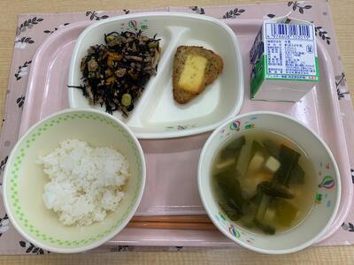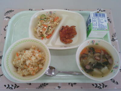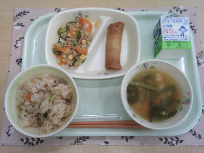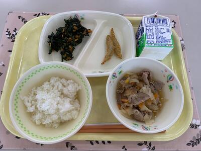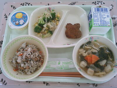そこで、今日からの1週間は、特に「歯」の健康によいものを取り入れた給食にしました。1日目は、カルシウムたっぷりの「いりこ入りごはん」とかみごたえのあるごぼうを使った「かりん揚げ」です。よくかんで、残さず食べましょう。