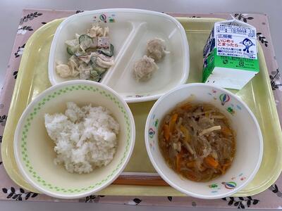 6月15日は「栃木県民の日」です。栃木県の誕生を祝い、県民が郷土への理解と関心を深め、より豊かな栃木県を築くことを目指す日とされています。当日は日曜日なので、給食では今日を県民の日のお祝い献立にしました。市貝町産や栃木県産の食材をたくさん使ったメニューです。地元でとれたおいしい食材を味わって食べてください。