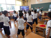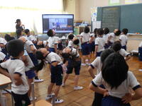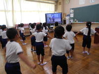 今日は、業間の「体力つくり」のときから暑さ指数が高かったため、オンラインでラジオ体操の練習をしました。子供たちは、体育主任の説明をよく聞いて、体を動かしていました。運動会でも体操します。上手になったところをお見せできるように頑張ります。どうぞお楽しみに。ピース