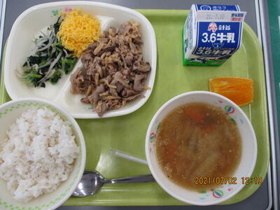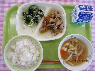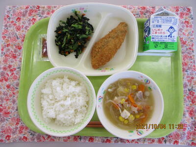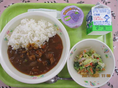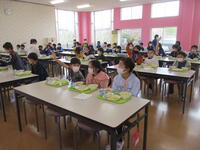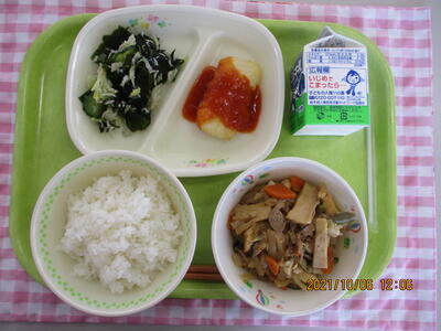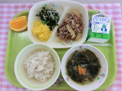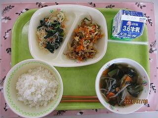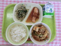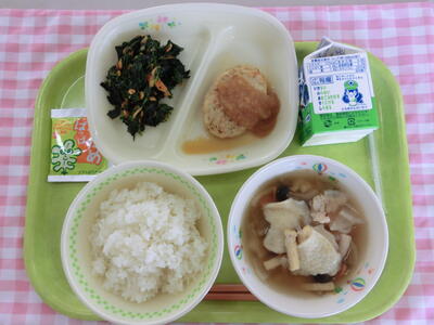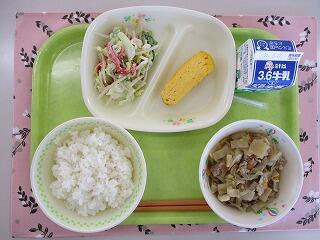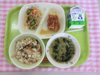 「あー、ひじきのふりかけだ。」「おいしそう。」「ひじきって野菜?」「海の中でとれるんだっけ。」などなど、給食の時間は楽しそうに話しかけてくれます。(配膳になるとコロナ対策で静かに配膳します。)食事は楽しみの一つですね。