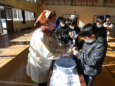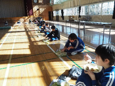 炊けたお米は給食の時間にいただきました。災害時の避難所を想定して体育館で給食を摂りました。自分たちで炊いたお米は大変美味しかったようです。