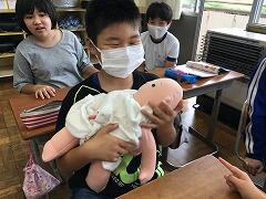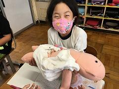 お母さんのお腹の中にいるときの様子を動画で見たり、赤ちゃんの人形を抱っこしたりしました。「意外と重い・・・」とびっくりしていました。
