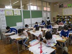 学力テスト2日目。 算数の学力テストを行いました。数の構成、順序、計算、計算の仕方の説明、かたち、時計の読み方など、学習したことはよくできていました。絵を見て問題を作ることがむずかしかったようです。引き算の問題は作れましたが、絵に合うようにとの条件が付いていたので、そこでつまずいていました。