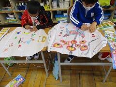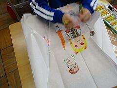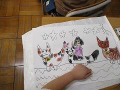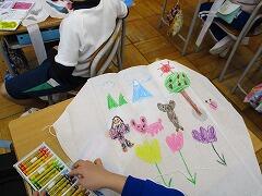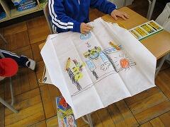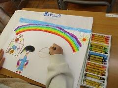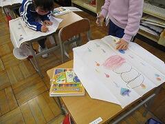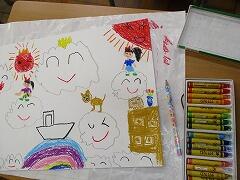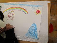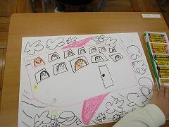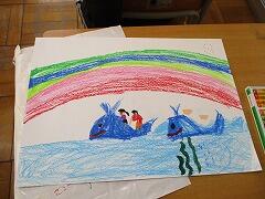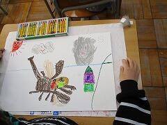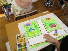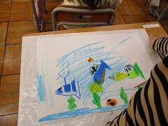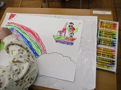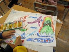 図工では、「のってみたいな いきたいな」の絵を描きました。自分の好きなものにのって、いってみたいと思うところを思い浮かべました。今日は、クレヨンで描きました。来週、絵の具で周りを塗って仕上げます。