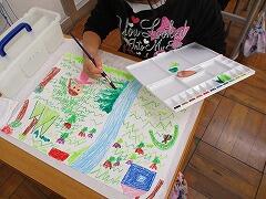 先週の続き、「おはなしからうまれたよ」を行いました。絵の具を使ってクレヨンで描いた周りを塗りました。
