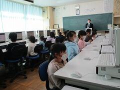 スッキトの方に「はじめてのパソコン」ということで、パソコン室の使い方の約束、パソコンの使い方、マウス操作の仕方を教えていただきました。2時間目は、マウスの使い方に慣れるために、パソコンでお絵かきをしました。
