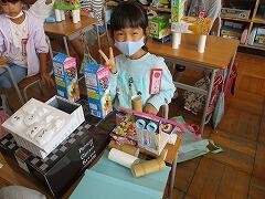 今日の図工は、「はこでつくったよ」を行いました。材料の準備お世話になりました。ありがとうございました。お陰様で、素敵な作品ができあがりました。昇降口の全校生の通る廊下に展示しました。他の学年の児童にも「すごいね。」「わかいいね。」とほめてもらいました。