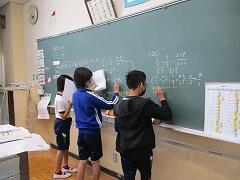 分数÷分数の学習をしています。計算の仕方について、自分の考えを友達と協力しながら発表しています。