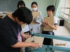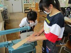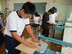 「1枚の板から」の学習で、電動のこぎりを使い生活に使える物を作成しています。電動のこぎりは5年生で使ったこともあり、上手に板を切ることができています。切った板を組み立てて、作品ができあがるのが楽しみです!!