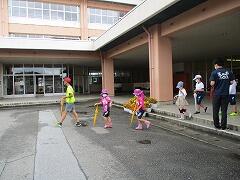 市貝小よい子のやくそくでは、「自転車は、きまりを守ってヘルメットをかぶって乗りましょう。」「※、子どもだけで乗るときは、1~3年生は自分の家の庭」となっています。4年生の交通安全教室があってから学区内を乗って良いことになります。