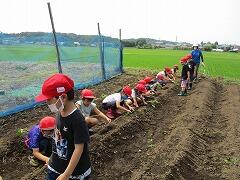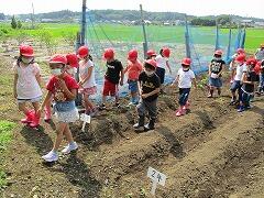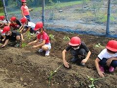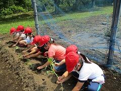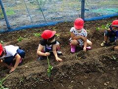 横向きに穴を掘って「なえのべっどをつくろう。」「おふとんいっぱいかけて。」「あたたかくしておやすみね。」