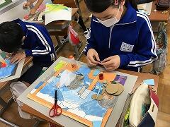 図工では、大切な思い出や風景を絵に表しました。人を描くのが難しいようで、「先生、横顔の写真を撮ってください」「後ろ向きに座っているように描きたいんです」と実際に自分の写真を見ながら絵に描いて頑張っていました。