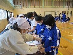 給食や清掃時には、スクールサポートスタッフの方が入ってくれています。この写真はおかわりのジャンケンをしているところです。