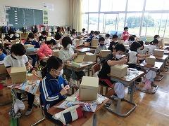 図工の学習では、段ボールに穴をあけて、そこから広がる世界を思い浮かべながら作っていました。