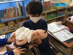 お母さんのお腹の中にいるときの様子を動画で見たり、赤ちゃんの人形を抱っこしたりしました。「意外と重い・・・」とびっくりしていました。