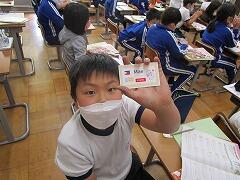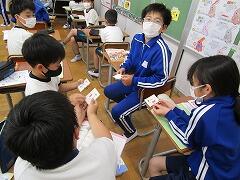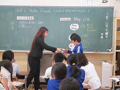今日は、単元の最後ということで、これまで学習したフレーズを使ってメイ先生と名刺交換をしました。