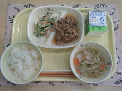 毎日の給食、全部食べると体にどんないいことがあるのでしょう。まずは主食。主食は炭水化物という栄養素をたくさん持っていて、みなさんの体を動かすエネルギーになります。残さず食べると運動も勉強も100%の力で頑張ることができます。次に主菜。主菜はたんぱく質がとれ、体を作る材料になります。人間の身体は毎日少しずつ新しいものに作りかえられているので、肉や魚、たまごなどのおかずを残さず食べると、丈夫な体を作ることができます。副菜ではビタミンや無機質がとれ、副菜をしっかりとることで健康を維持することができます。食べたものは全てが自分の栄養になります。残さず食べましょうね。