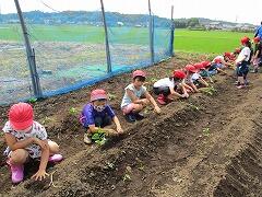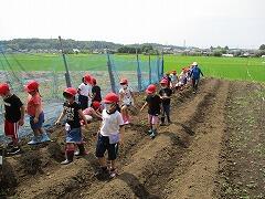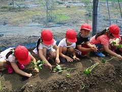 横向きに穴を掘って「なえのべっどをつくろう。」「おふとんいっぱいかけて。」「あたたかくしておやすみね。」