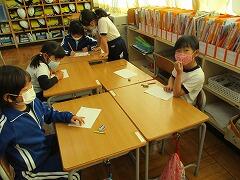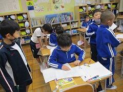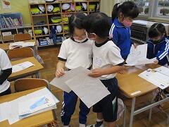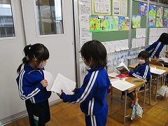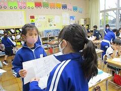 1校時 国語 「おもい出してかこう」の作文ができあがったので、友達と交換して読み感想を伝え合いました。