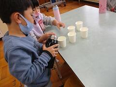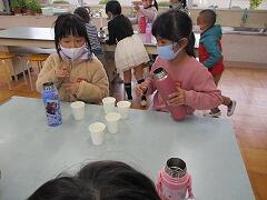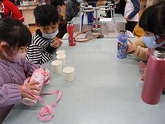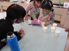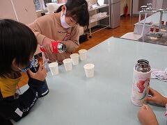 算数の「くらべかた」では、自分の水筒にコップ何杯分の水が入るのかを調べて比べました。