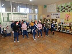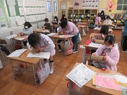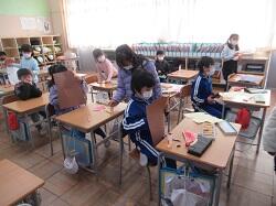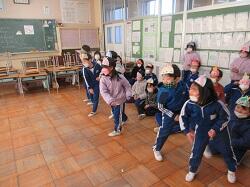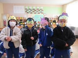 3日(木)、1年生は昨日の生活科で作った鬼のお面をかぶり、教室で豆まきをしました。